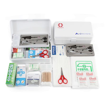 - 기본적인 응급처치 용품(거즈, 반창고, 붕대)에서부터 가위, 핀셋 등 필수 의료기구 포함.