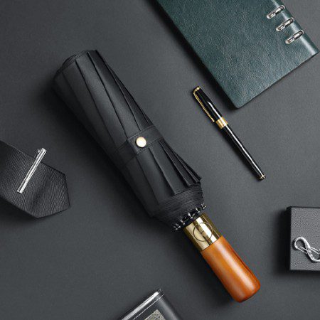 우산 손잡이에 최고급 가죽끈과 우드 소재를 사용하여 우아한 외관과 실용성을 제공합니다. 이러한 고급 디자인은 우산판촉물로 활용 시 브랜드 이미지를 격상시킬 수 있습니다.