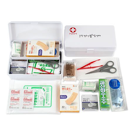 - 구성품: 소독용 거즈, 붕대, 가위, 면봉, 멸균거즈 등 다양한 응급처치 용품이 포함되어 있습니다.
