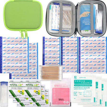 - 드레싱밴드, 알코올 솜, 면봉 등 응급처치 필수 용품 구성.